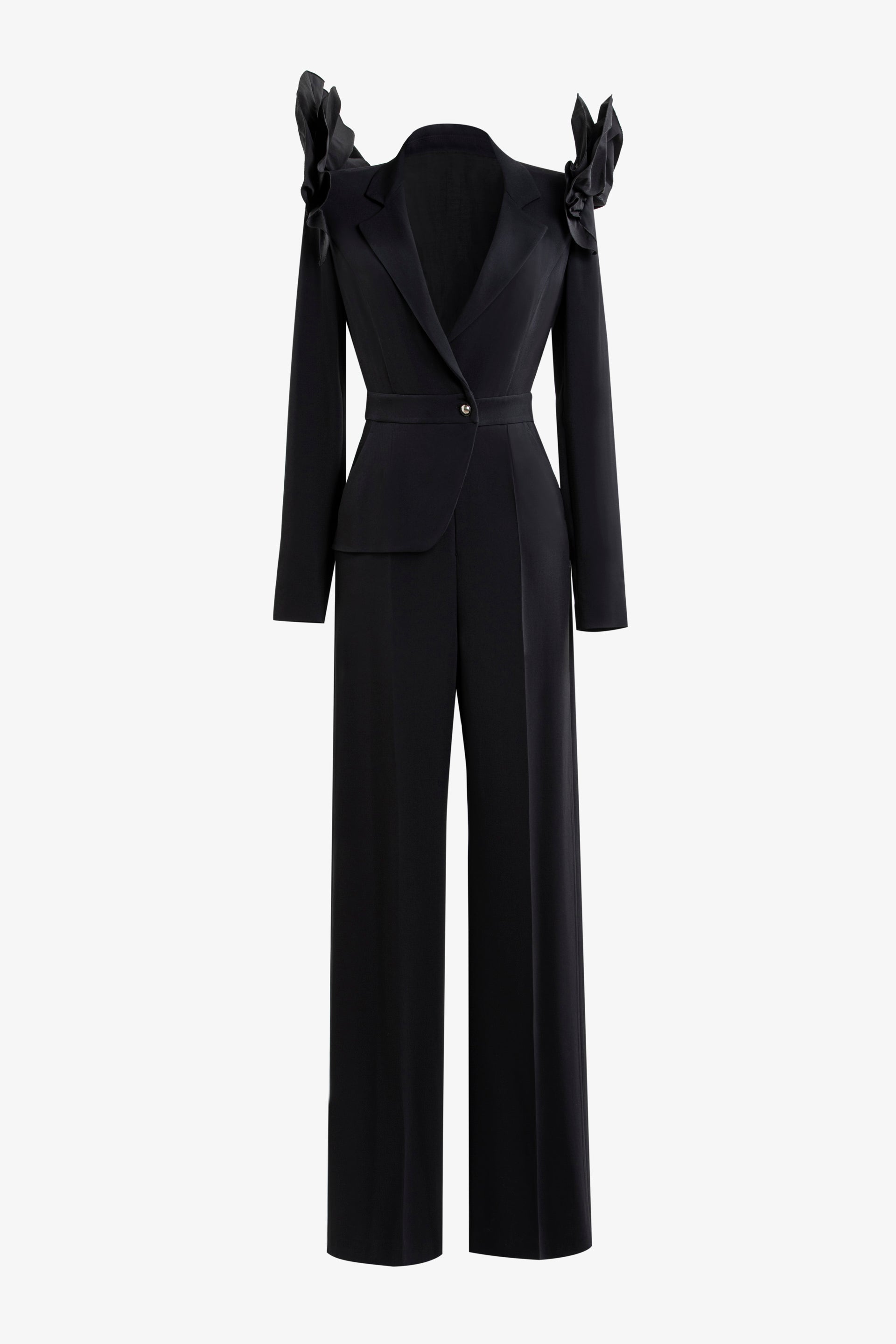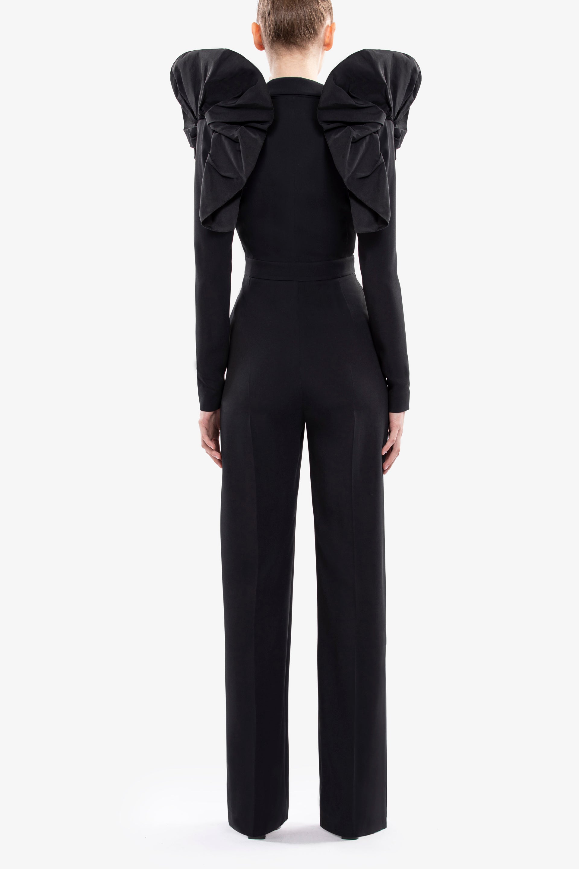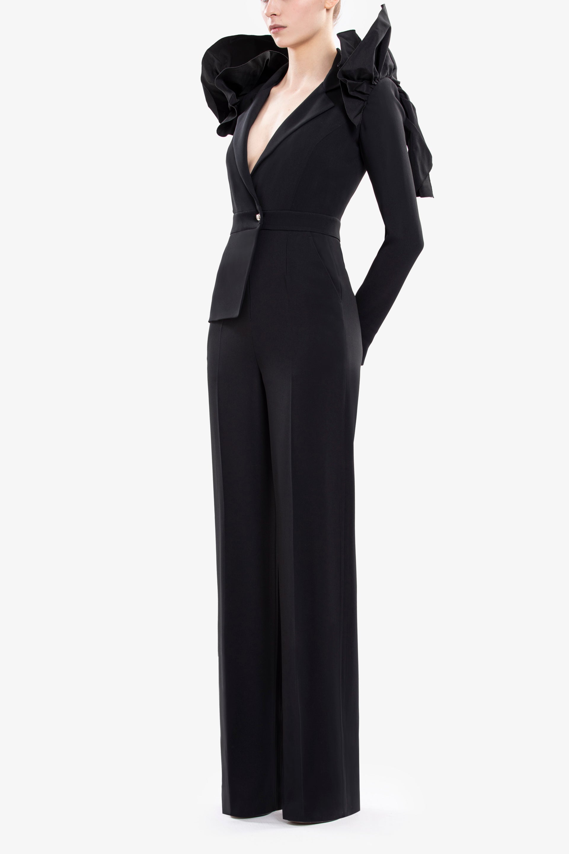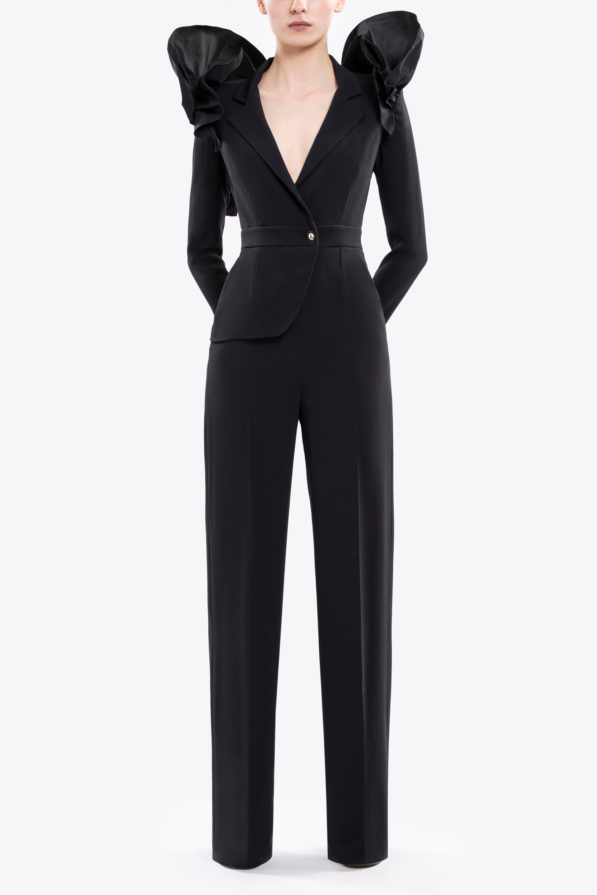 تتميز البدلة القصيرة المصنوعة من الكريب الأسود الفاحم بسترة مصممة من جانب واحد بتصميم غير متماثل، مع زخارف من التفتا الأسود الفاحم على الكتفين.