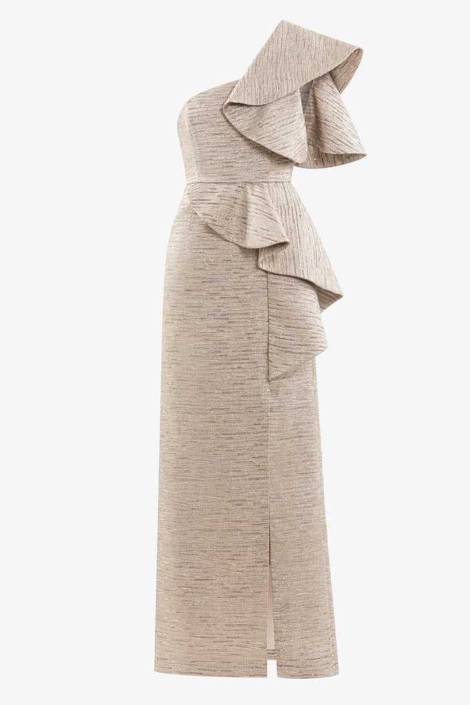 يتميز جمبسوت مارلن بسترة مصممة من جانب واحد بتصميم غير متماثل، مزينة بكشكشة من التفتا باللون الأسود النفاث على الكتفين. يُنسق مع بنطلون بقصة مستقيمة ومزين بزر ذهبي SK.