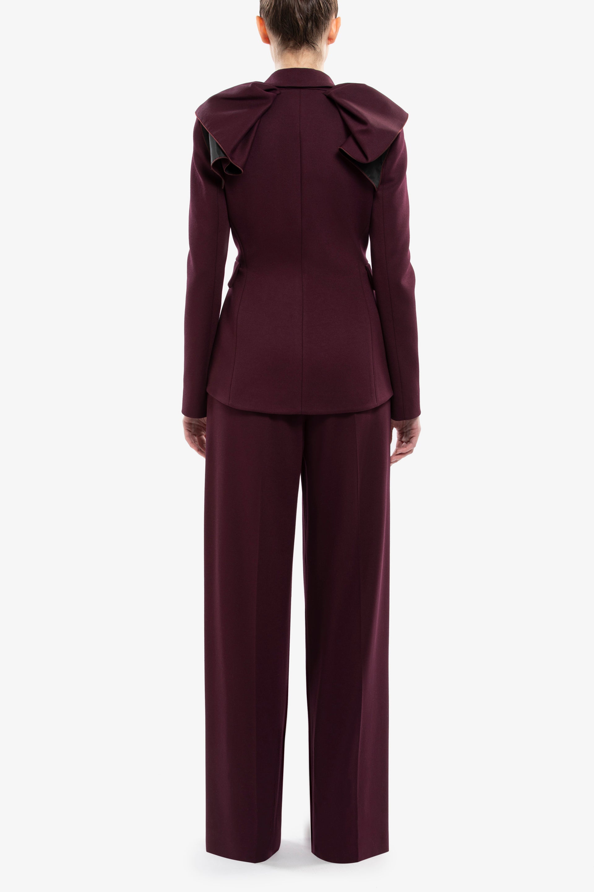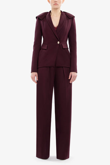 جاكيت إيطالي مصمم خصيصاً باللون البرقوقي الإيطالي يتميز بكشكشتين على الكتف لإضفاء لمسة فريدة ومزين بزر SK.