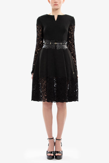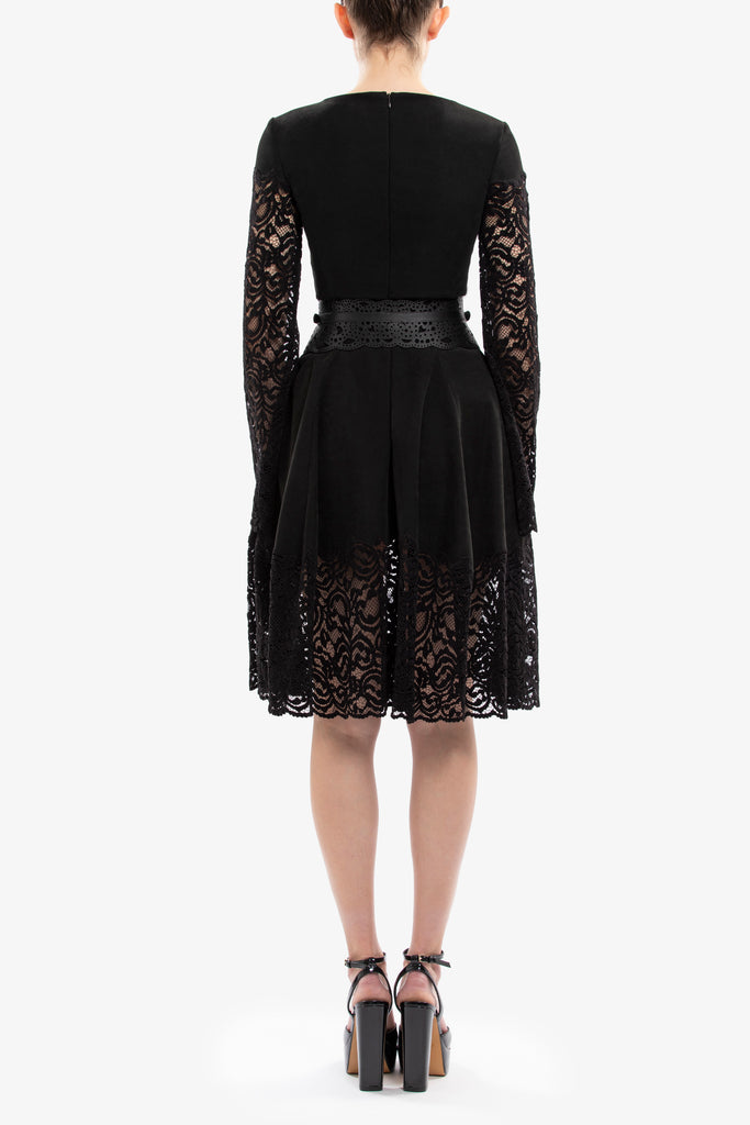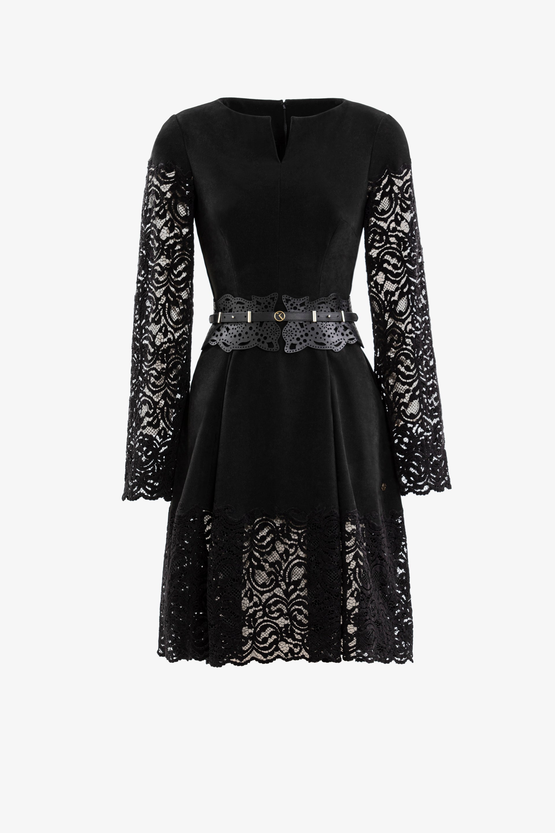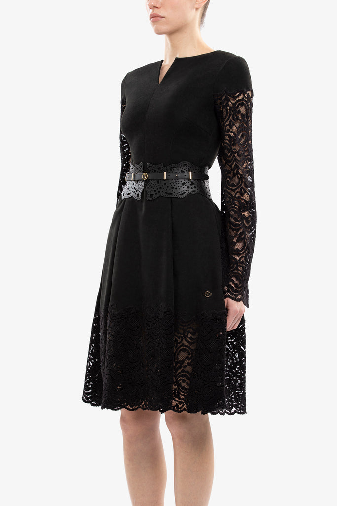فستان قصير من الدانتيل الأسود النفاث مع تفاصيل دانتيل رقيقة على الأكمام وحافة التنورة، مع حزام SK من الجلد المثقوب 100%.