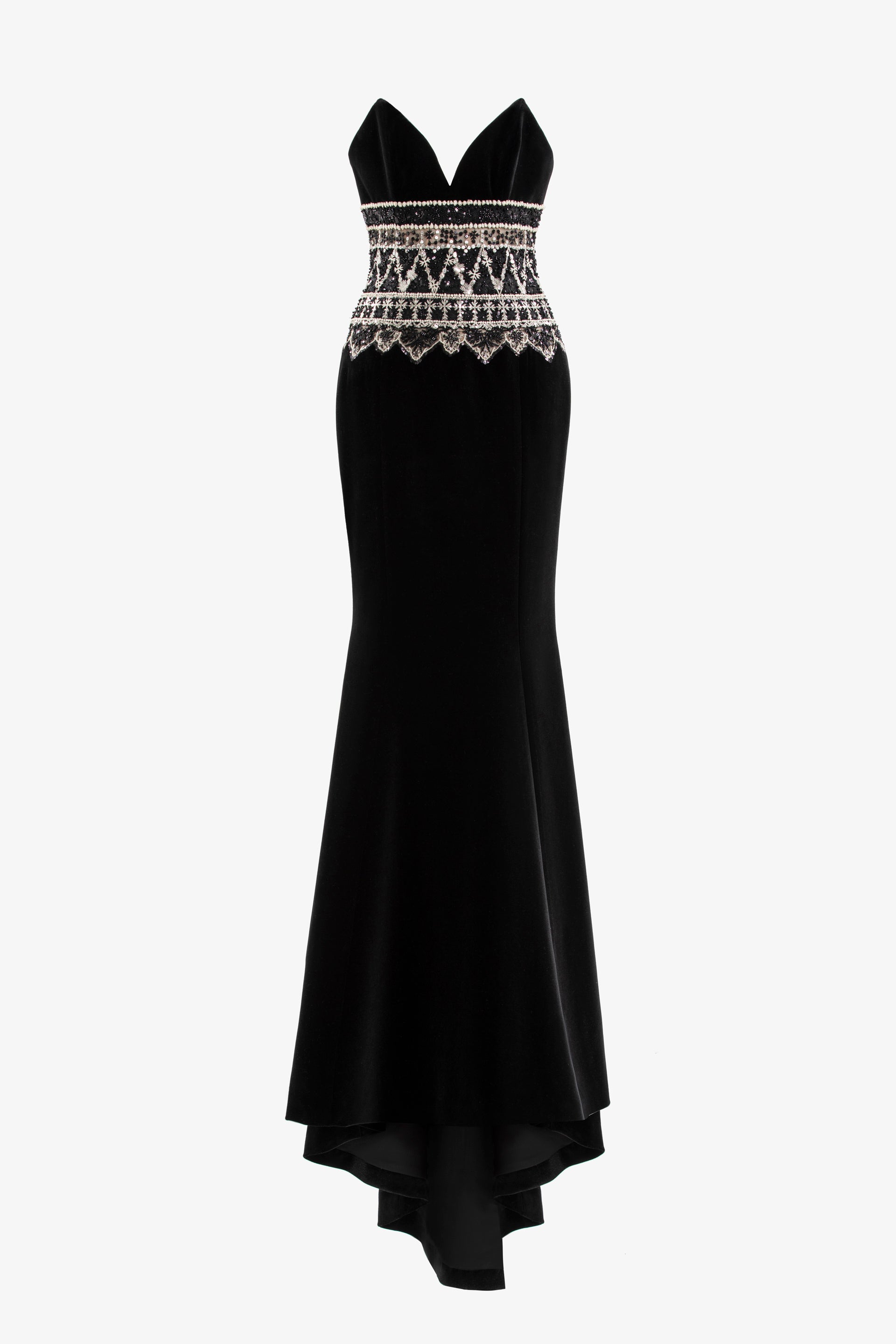 فستان مخملي أسود فاحم اللون بدون حمالات بقصّة ضيّقة وتنورة طويلة، مزين بتطريزات معقدة من أسفل الصدر إلى خط الورك.