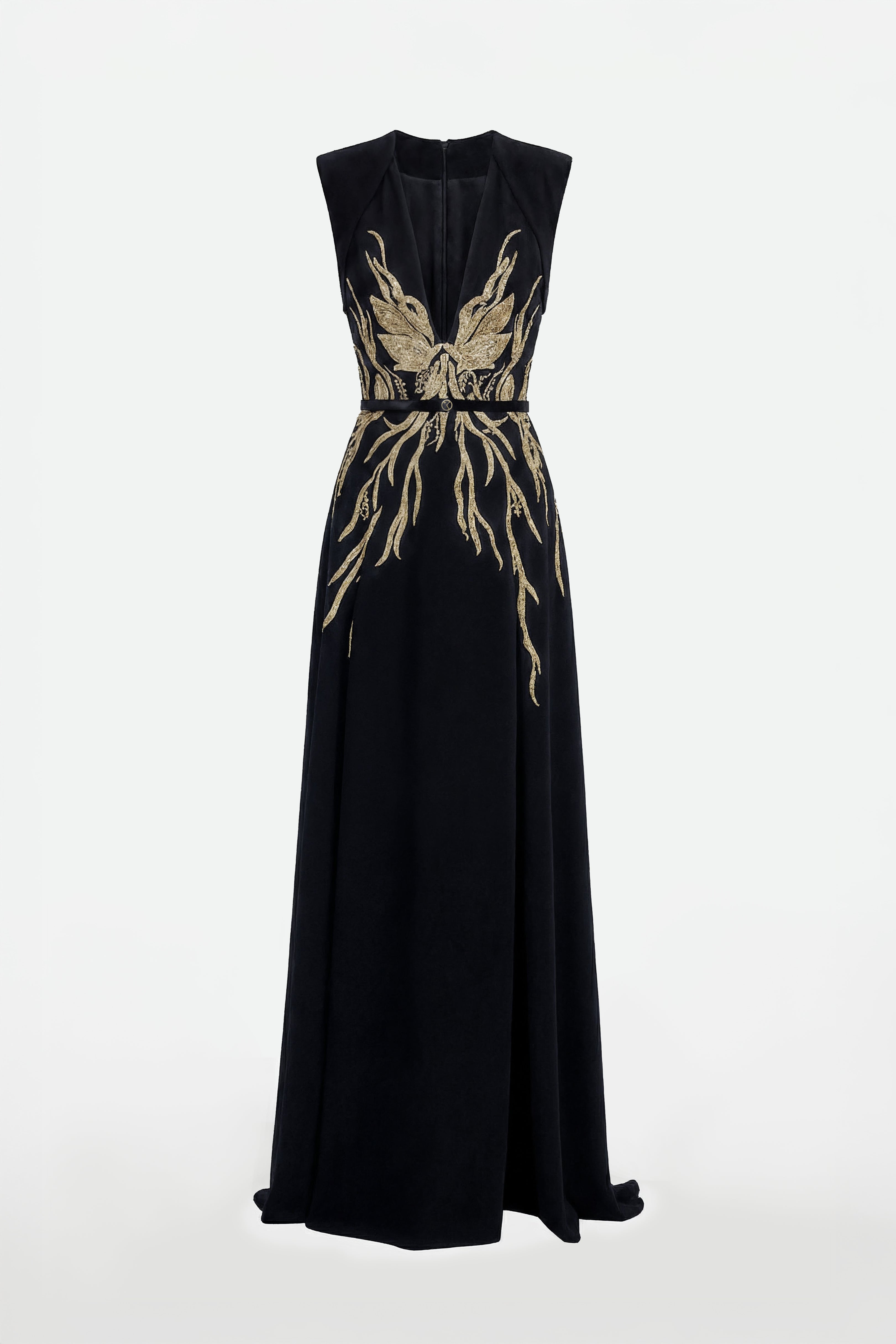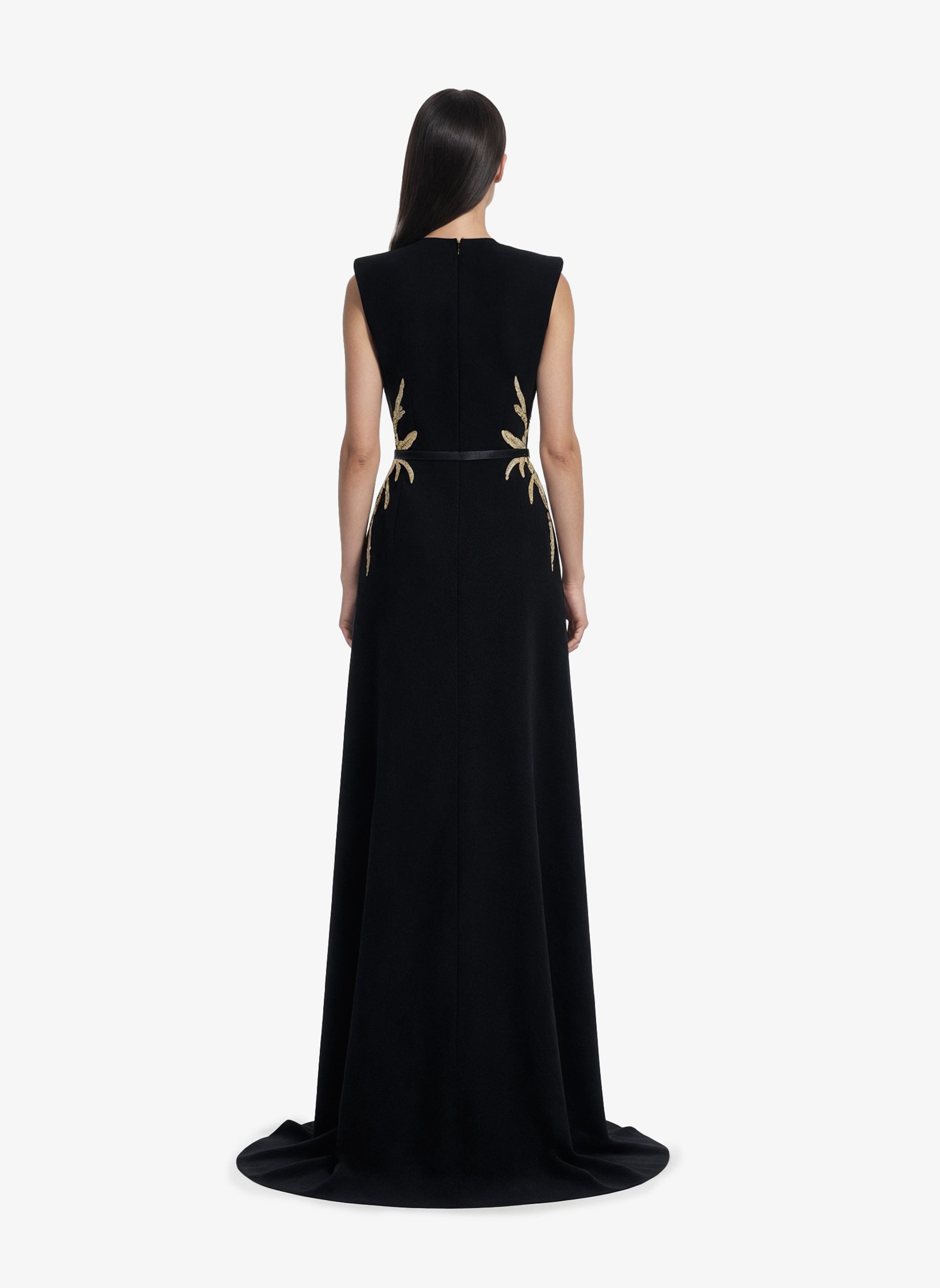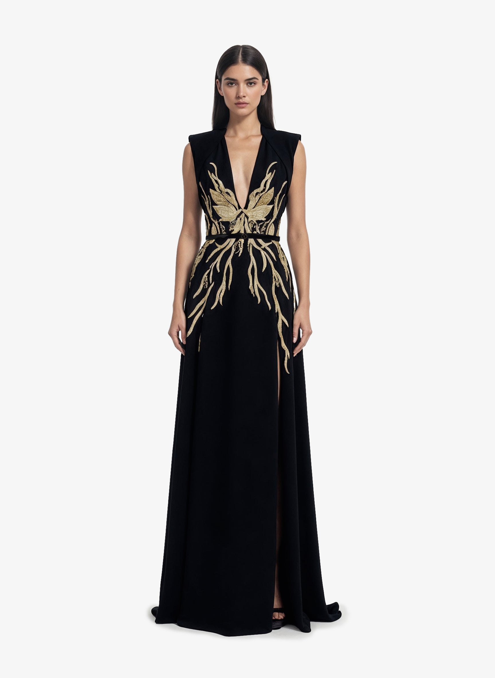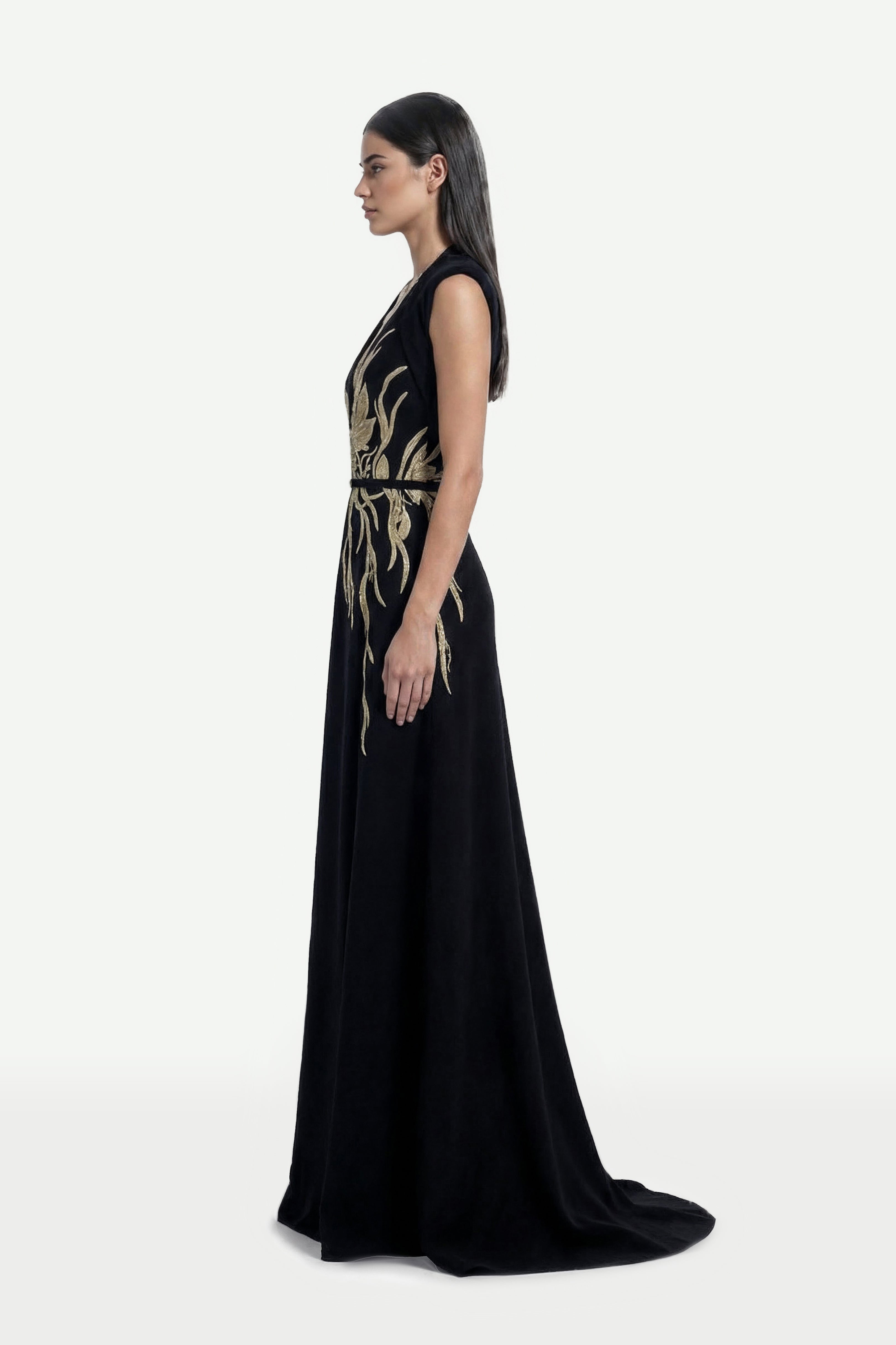 فستان كريب أسود فاحم، يتميز بتطريزات ذهبية معقدة تمتد من الصدر إلى الوركين. يبرز التصميم المنحوت أناقة راقية، حيث يمزج بين الخياطة المعمارية والزخارف الدقيقة.
