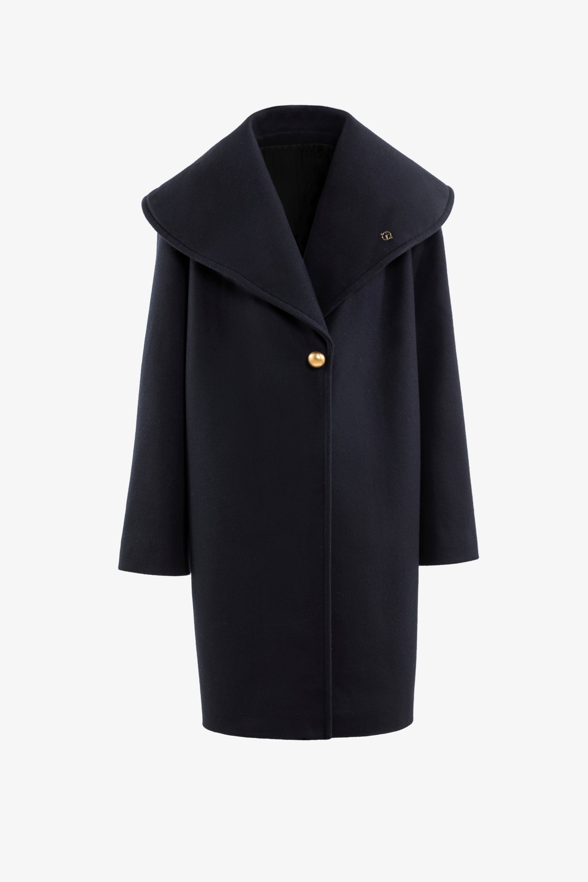معطف من الصوف الأزرق الكحلي يتميز بطية صدر عريضة مزينة بشعار SK وأكمام طويلة وتصميم أنيق متوسط الطول.